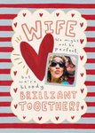 Featuring a scalloped cream panel with gold trim in the centre of the card which consists of a red heart, playful hand-lettering and one photo frame. The background is red and blue stripes.
