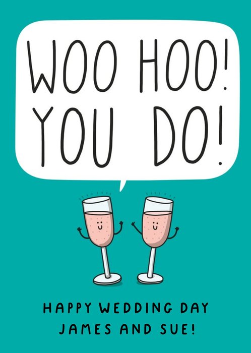 Features 2 glasses of bubbles. Text reads "Woo hoo! You do! Happy wedding day name and adb"