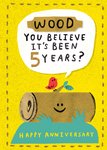 Featuring a smiling cartoon tree log with a cheerful red bird perched on top, set on a grassy mound with a bright yellow background and stitched border detail. A playful speech bubble with bold black lettering delivers the pun message celebrating a 5th wedding anniversary, traditionally known as the wood anniversary. A fun and quirky design, perfect for marking five happy years together.