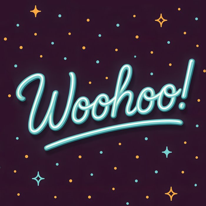 Featuring neon-style script typography surrounded by small sparkles and confetti dots on a dark purple background.