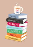 A warm and heartfelt Father's Day card featuring a colourful illustrated stack of books with a coffee mug on top reading "World's Best Dad." Each book spine carries a message of gratitude, from bedtime stories to pep talks and life lessons—perfect for the dad who’s always been there with wisdom and love.