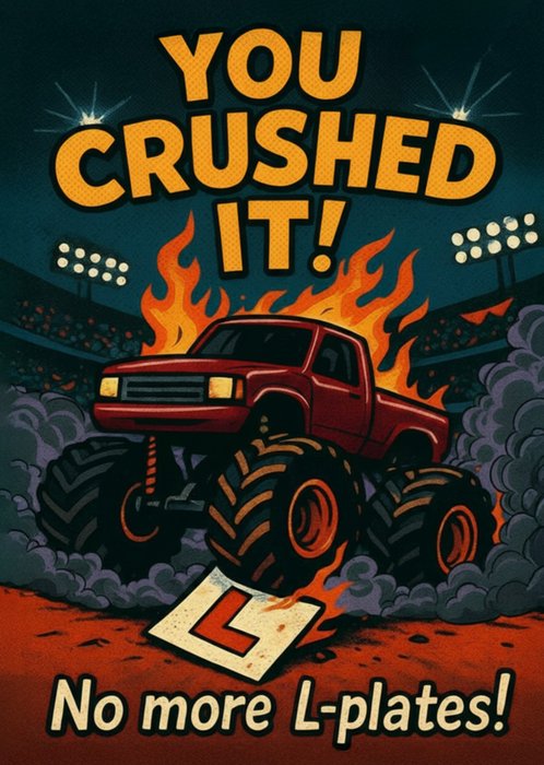 A modern design featuring a red monster truck with giant tyres and a flaming exhaust, crushing an L-plate. The design sits on a dark blue stadium background.