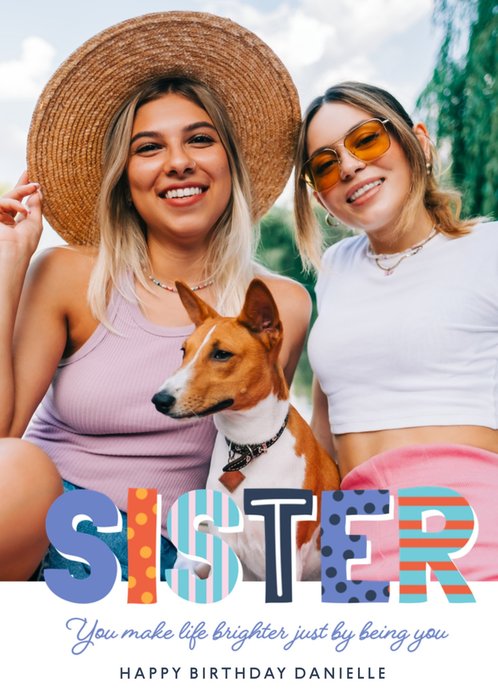 Featuring one large rectangular photo upload frame at the top, with bold multicoloured patterned block lettering spelling “SISTER” beneath, a flowing handwritten-style line of text in purple script, and a neat uppercase caption strip at the bottom, all on a clean white background.