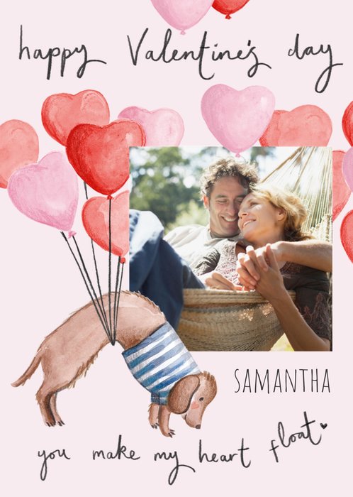 Front of card: Featuring an illustration of a dachshund floating with heart shaped balloons. Text reads: "Happy Valentine's Day Samantha you make my heart float". 'Samantha' can be personalised!