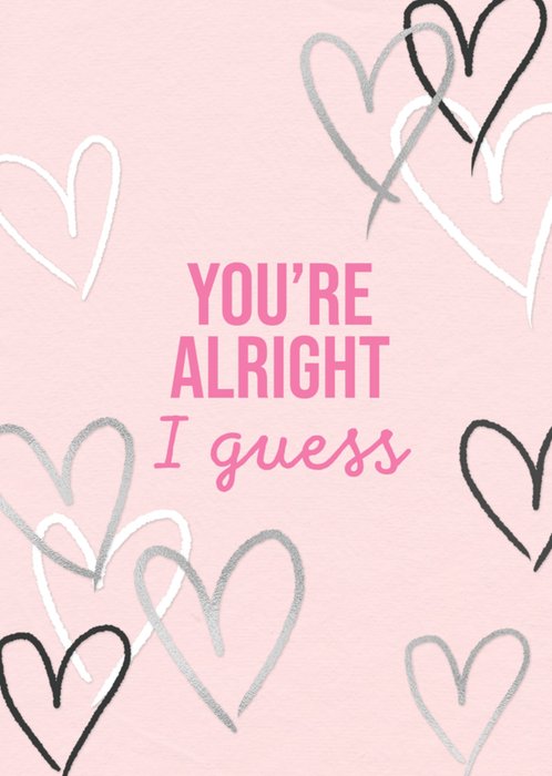 Simple drawn heart outlines in black, white and silver foil effect, surround central text, on a light pink background.
