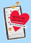 Featuring an illustrated mobile phone screen with floating emoji reactions and small red hearts, with a large red heart overlay containing the message “you’re my favourite” and a banner reading “notification”, on a light blue background.