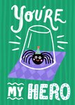 A humorous illustrated card featuring a cute cartoon spider wearing a party hat, safely under a glass, with the phrase "You're My Hero"—perfect for someone who bravely handles creepy crawlies.