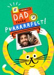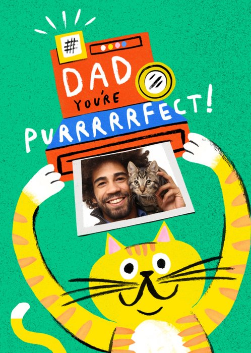 A playful and colourful Father's Day card featuring a yellow illustrated cat holding up a red and blue instant camera with white hand-drawn text. A photo upload frame, styled as an instant photo, appears emerging from the camera, set against a bright green background with sketchy stars and bold accents. A fun and pun-filled card perfect for cat lovers.
