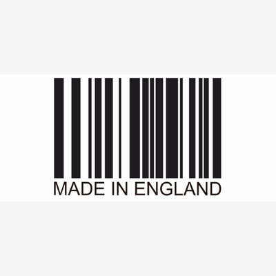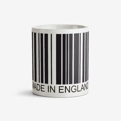 White mug with a black barcode and caption that reads Made In England