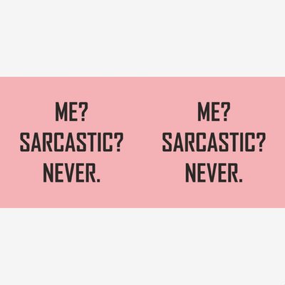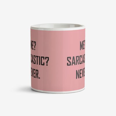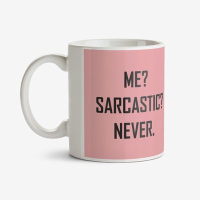 Pink typographic mug with a caption that reads Me? Sarcastic? Never